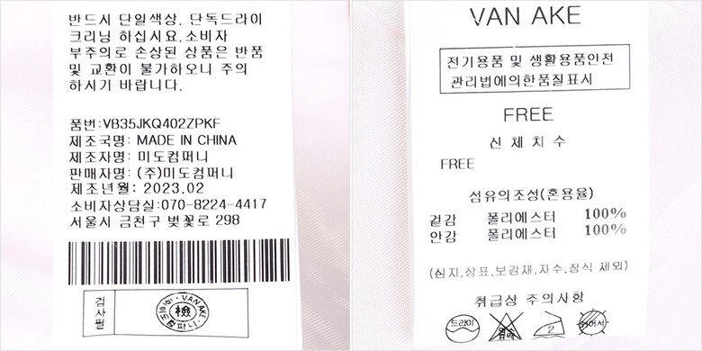 | 1. 제품 소재 (섬유의 조성 또는 혼용률을 백분율로 표시, 기능성인 경우 성적서 또는 허가서) | 겉감-폴리에스터100% 안감-폴리에스터100% |