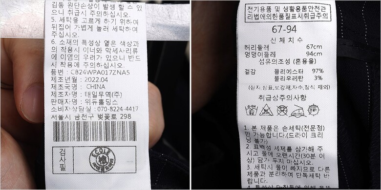 | 1. 제품 소재 (섬유의 조성 또는 혼용률을 백분율로 표시, 기능성인 경우 성적서 또는 허가서) | 겉감-폴리에스터97% 폴리우레탄3% |