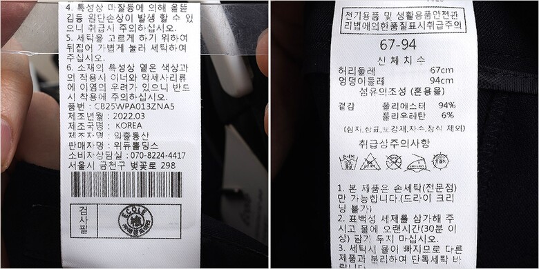 | 1. 제품 소재 (섬유의 조성 또는 혼용률을 백분율로 표시, 기능성인 경우 성적서 또는 허가서) | 겉감-폴리에스터94% 폴리우레탄6% |