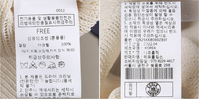 | 1. 제품 소재 (섬유의 조성 또는 혼용률을 백분율로 표시, 기능성인 경우 성적서 또는 허가서) | 겉감-아크릴100% |
