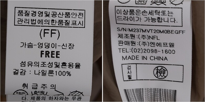 | 1. 제품 소재 (섬유의 조성 또는 혼용률을 백분율로 표시, 기능성인 경우 성적서 또는 허가서) | 겉감-나일론100% |