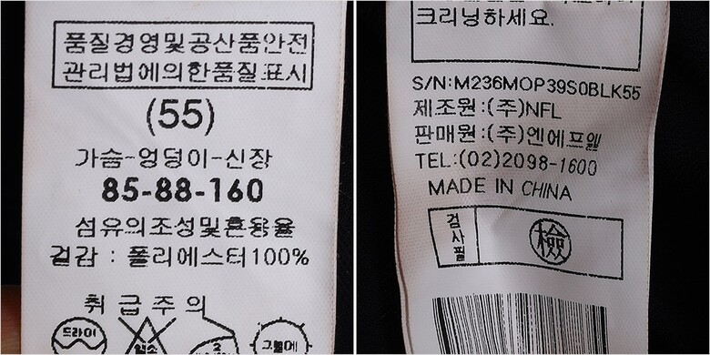 | 1. 제품 소재 (섬유의 조성 또는 혼용률을 백분율로 표시, 기능성인 경우 성적서 또는 허가서) | 겉감-폴리에스터100% |