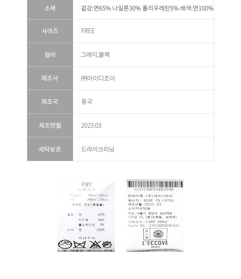 1. 제품 소재 (섬유의 조성 또는 혼용률을 백분율로 표시, 기능성인 경우 성적서 또는 허가서) | 상세페이지 참조 |
