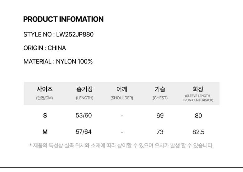 | 1. 제품 소재 (섬유의 조성 또는 혼용률을 백분율로 표시, 기능성인 경우 성적서 또는 허가서) | 겉감:나일론 100% |