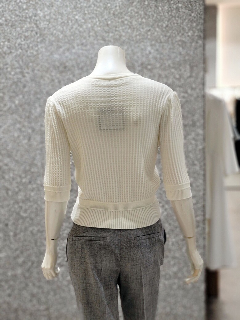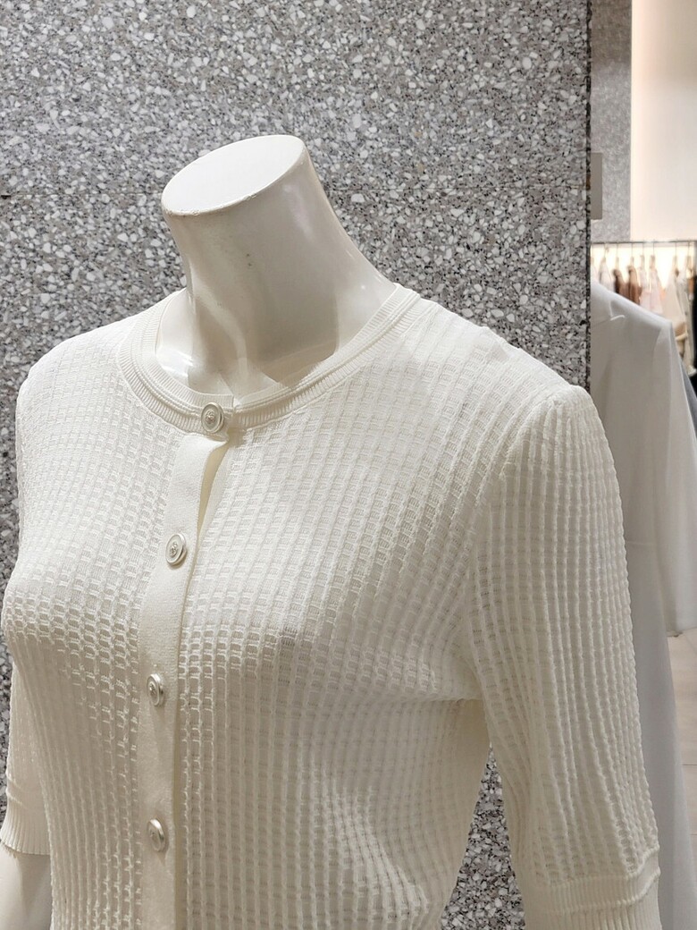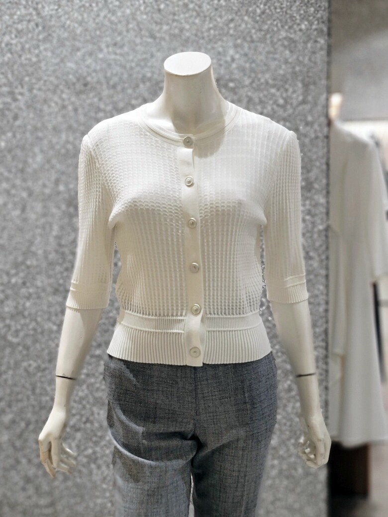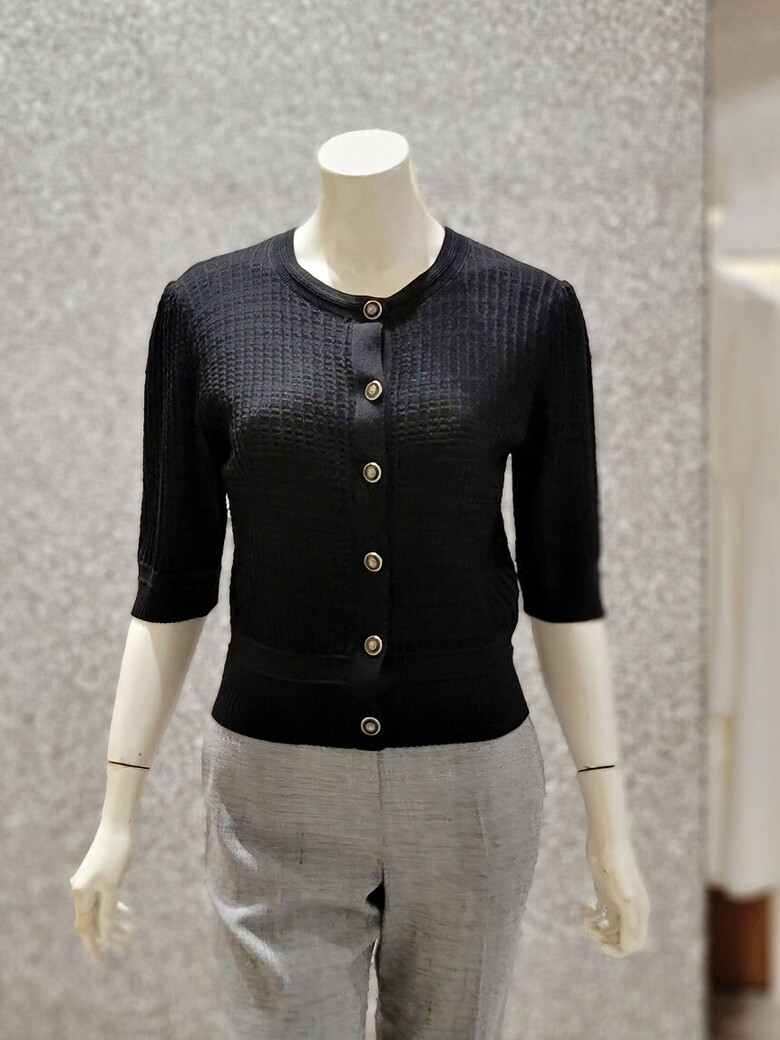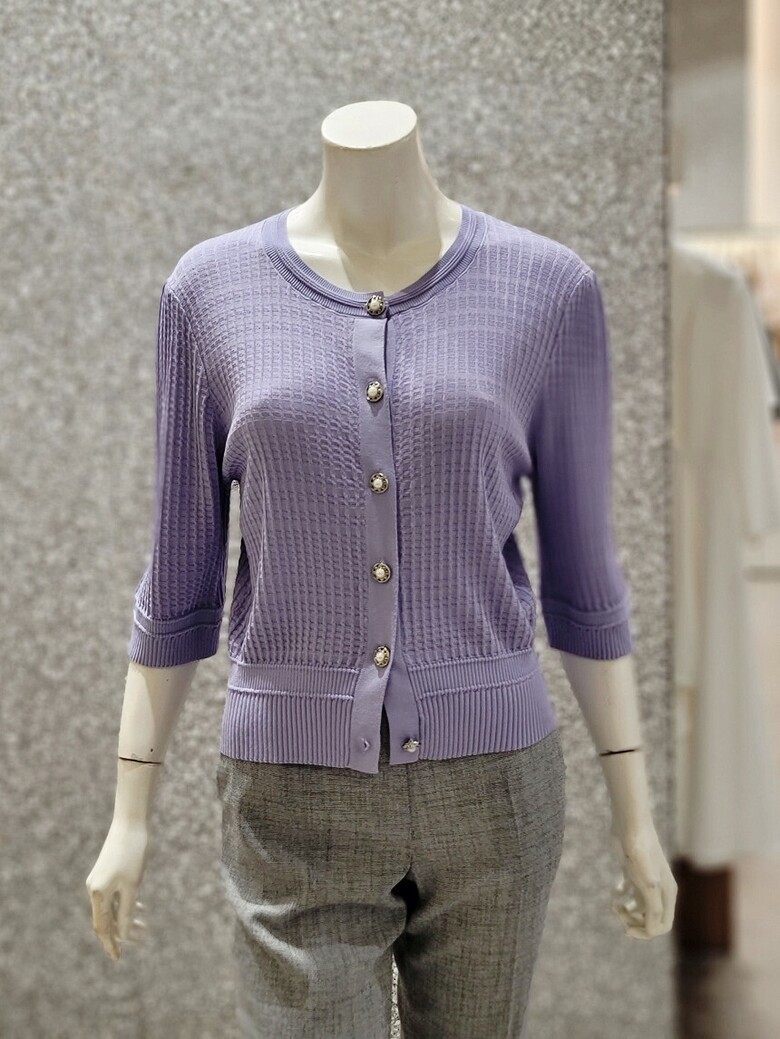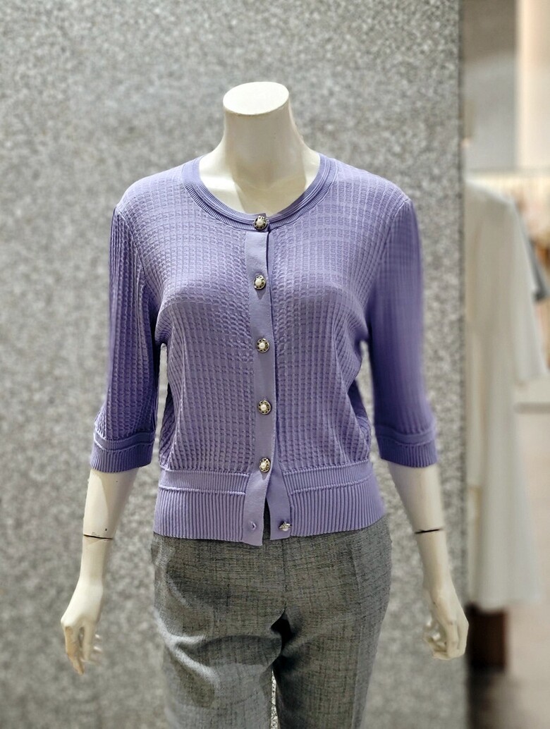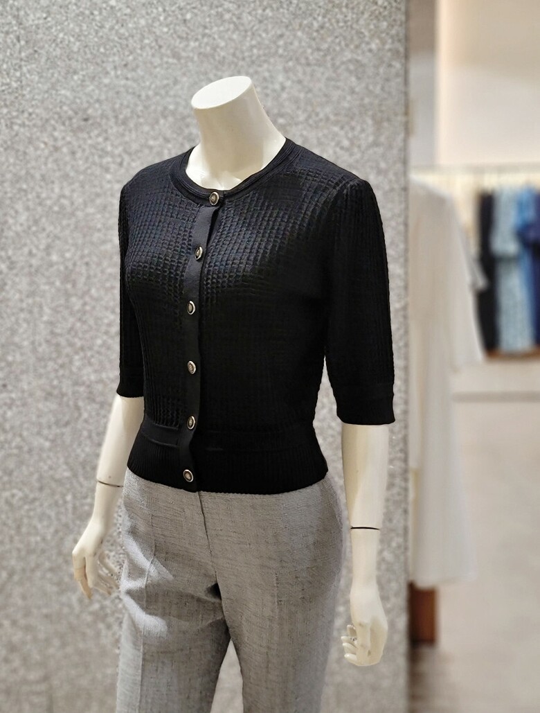 니트 짜임이 돋보이며 여밈 라인 쥬얼 버튼 포인트