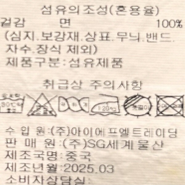 | 1. 제품 소재 (섬유의 조성 또는 혼용률을 백분율로 표시, 기능성인 경우 성적서 또는 허가서) | 겉감-면100% |