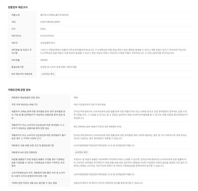 | 6. 세탁방법 및 취급시 주의사항 | 상품상세참조 |