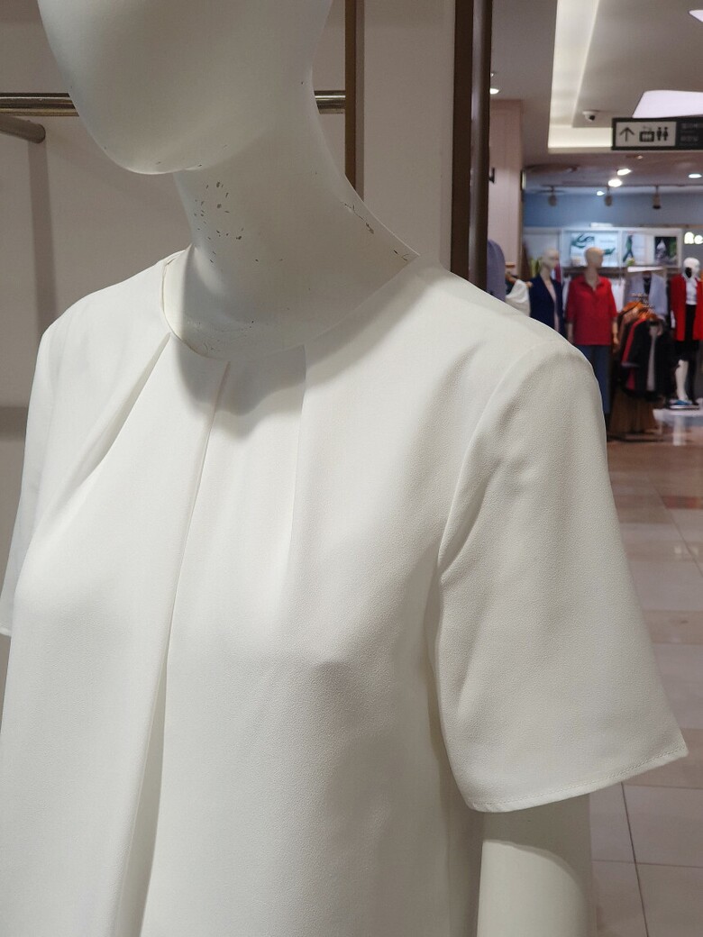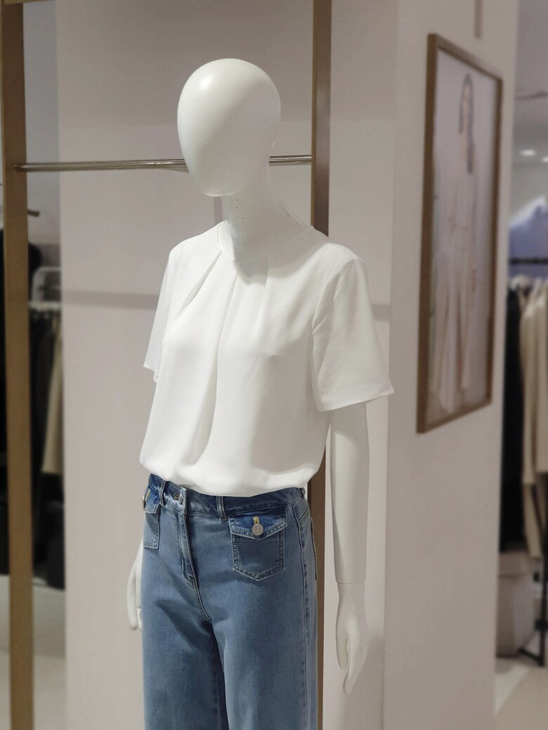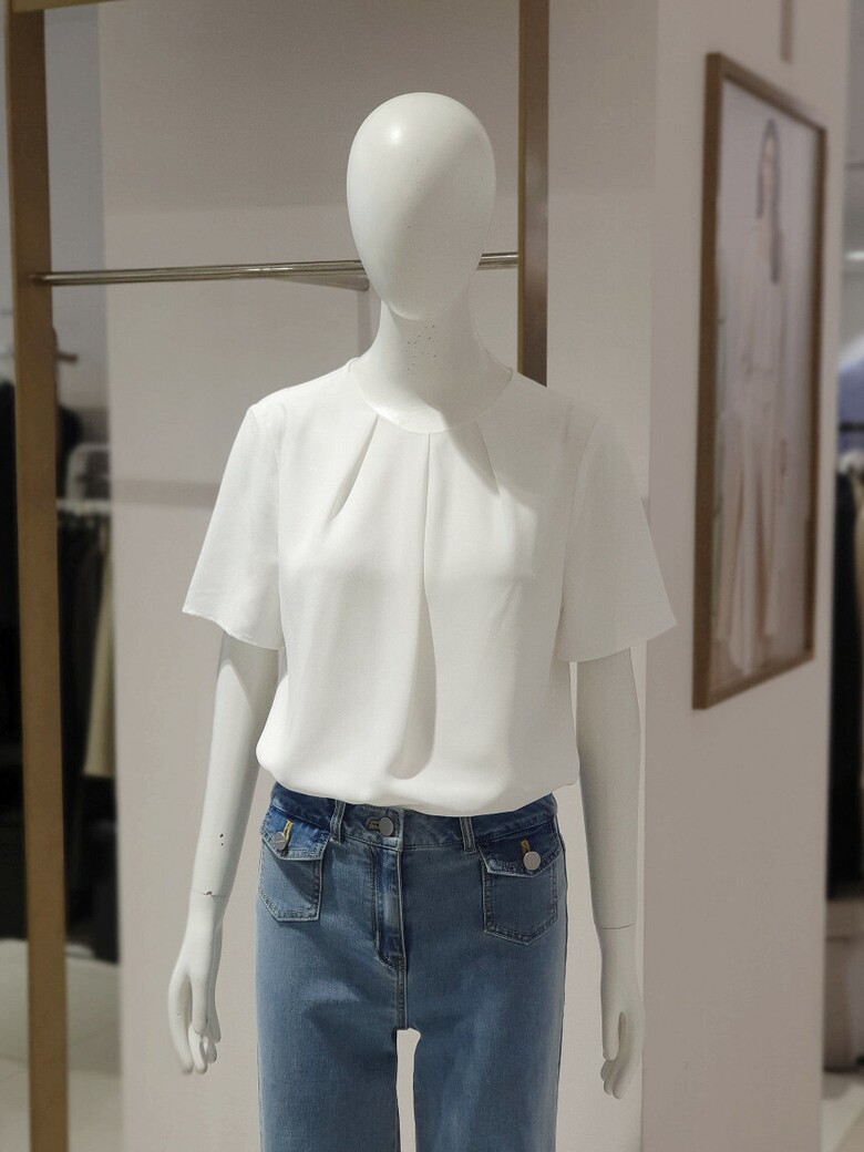 라운드 넥 라인에 핀턱 디테일로 입체감을