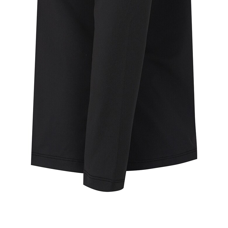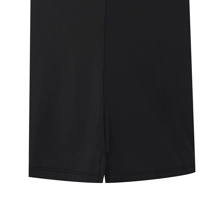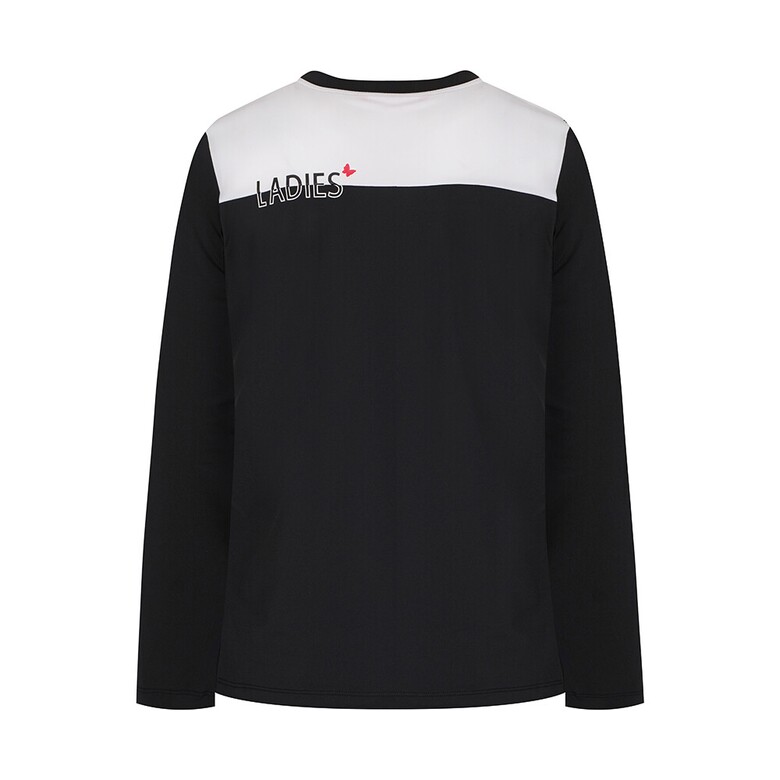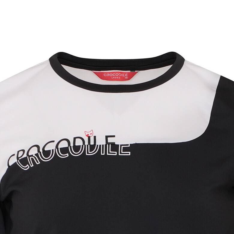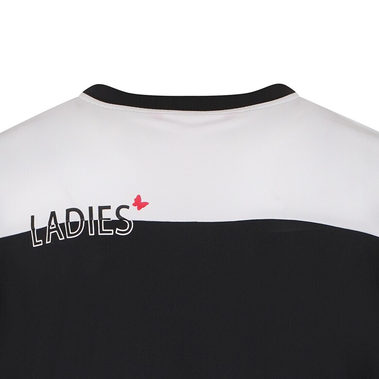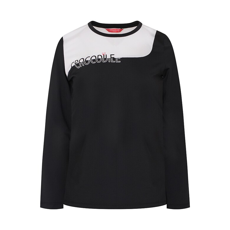 폴리스판 소재를 사용하였고 앞뒤판 곡선형태의 절개라인의 프린트와 배색이 여성스러우면서도 스포티한 느낌을 주는 라운드넥 냉감 티셔츠