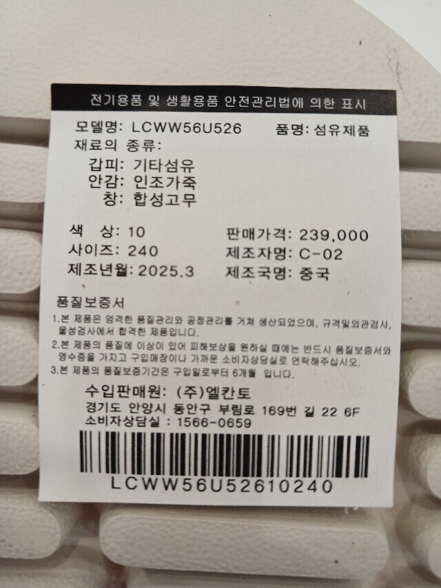 | 1. 제품 소재 (운동화인 경우에는 겉감, 안감을 구분하여 표시) | 상품상세참조 |