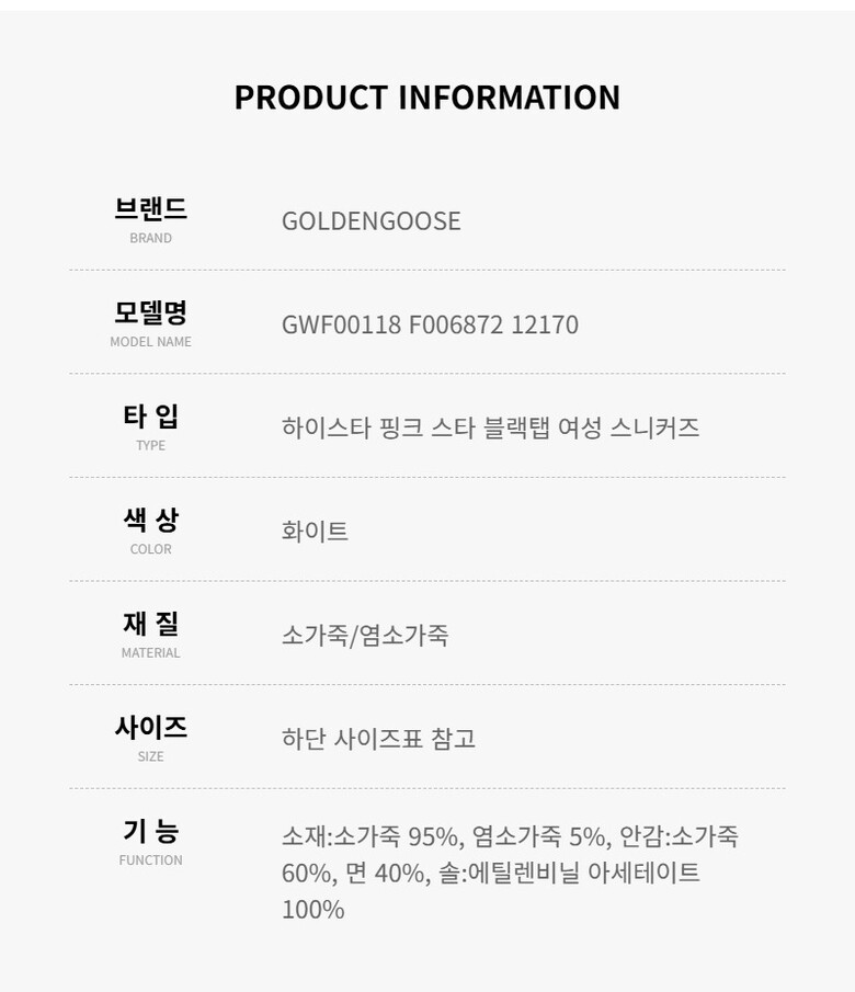 1. 제품 소재 (운동화인 경우에는 겉감, 안감을 구분하여 표시) 상세페이지 참조
