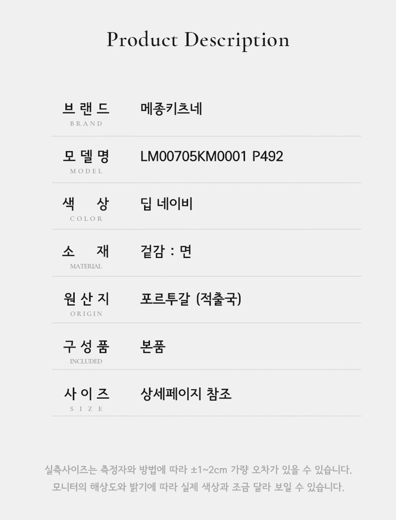 | 1. 제품 소재 (섬유의 조성 또는 혼용률을 백분율로 표시, 기능성인 경우 성적서 또는 허가서) | 상세페이지 참조 |