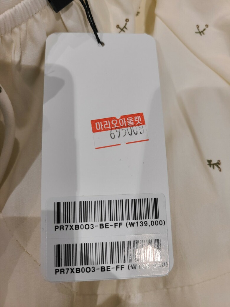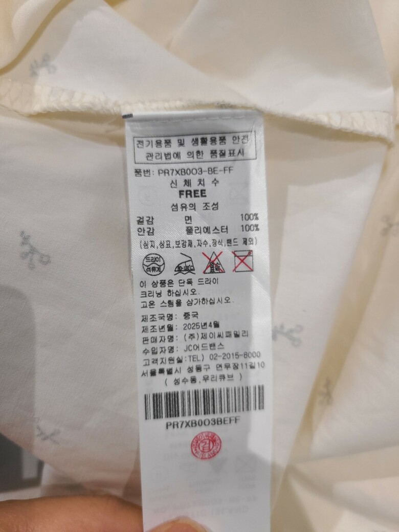 | 1. 제품 소재 (섬유의 조성 또는 혼용률을 백분율로 표시, 기능성인 경우 성적서 또는 허가서) | 면 100% / 안감:폴리에스테르 100% |