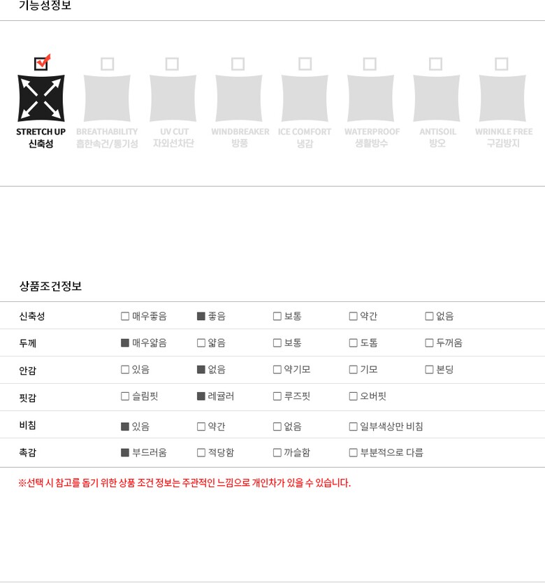 1. 제품 소재 (섬유의 조성 또는 혼용률을 백분율로 표시, 기능성인 경우 성적서 또는 허가서) 면50%,폴리에스터38%,폴리우레탄12%
