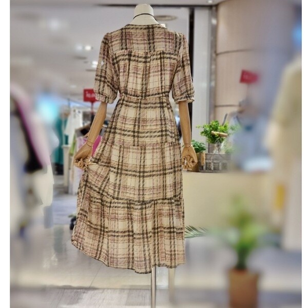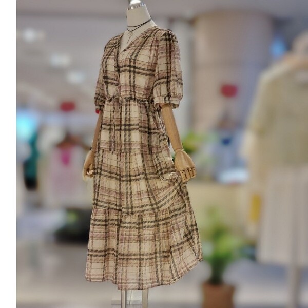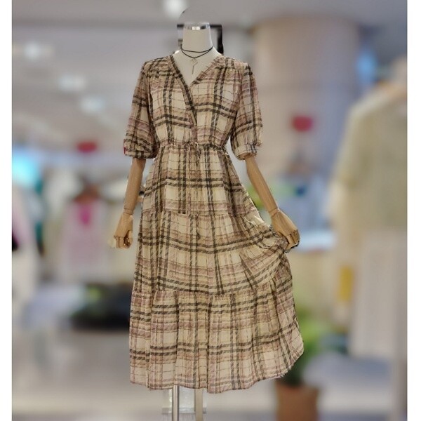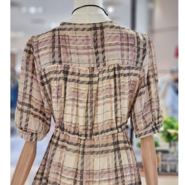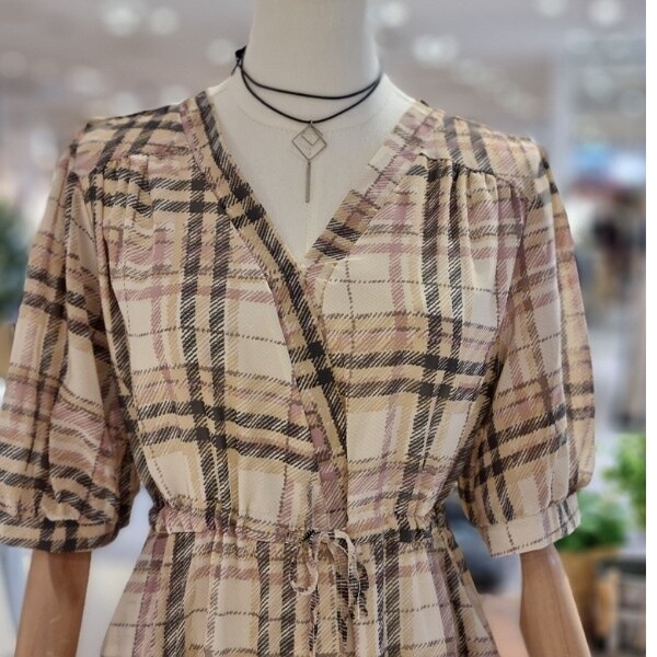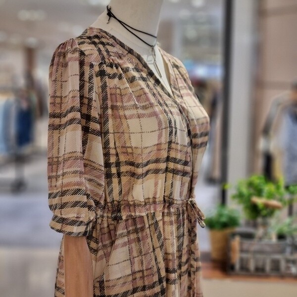 어깨와 등판셔링으로 여유핏허리끈으로 조절가능체크프린팅으로 세련미 가미5부소매?쉬폰원피스