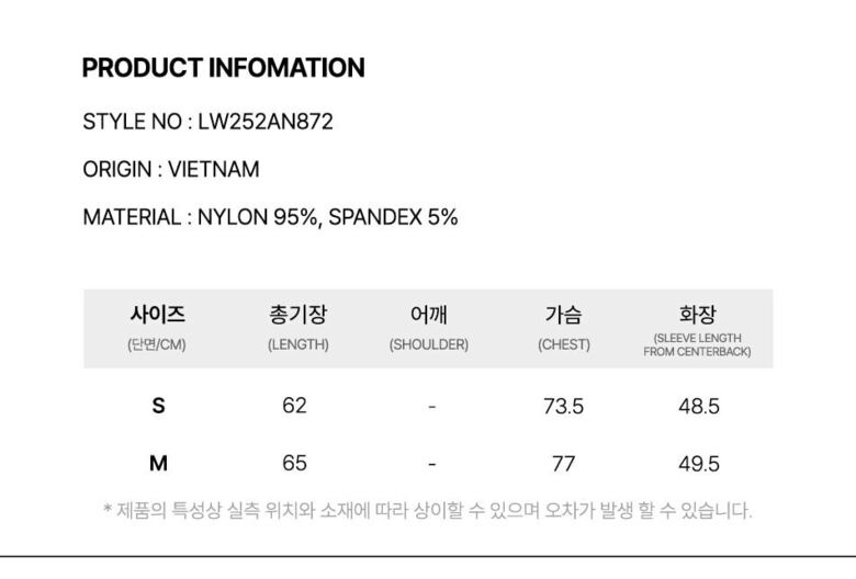 | 1. 제품 소재 (섬유의 조성 또는 혼용률을 백분율로 표시, 기능성인 경우 성적서 또는 허가서) | 겉감:나일론 95%, 폴리우레탄 5% |