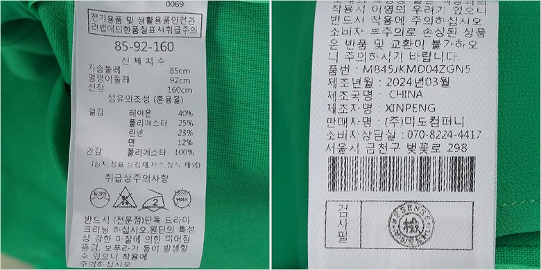 | 1. 제품 소재 (섬유의 조성 또는 혼용률을 백분율로 표시, 기능성인 경우 성적서 또는 허가서) | 겉감-면12% 폴리에스터25% 레이온40% 린넨23% 안감-폴리에스터100% |