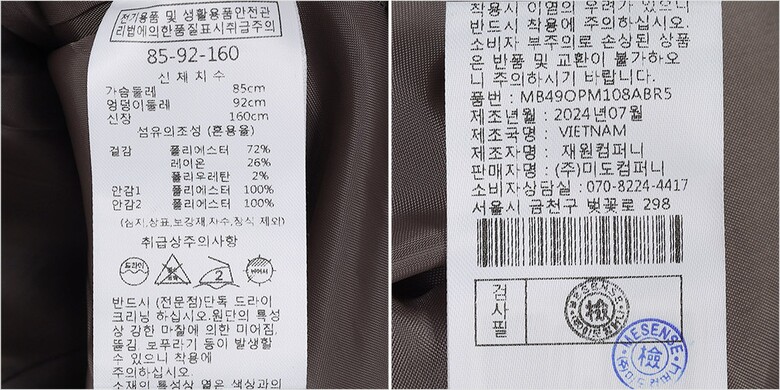 | 1. 제품 소재 (섬유의 조성 또는 혼용률을 백분율로 표시, 기능성인 경우 성적서 또는 허가서) | 겉감-폴리에스터72% 폴리우레탄2% 레이온26% 안감1-폴리에스터100% 안감2-폴리에스터100% |