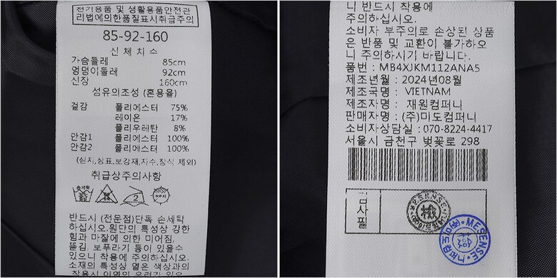 | 1. 제품 소재 (섬유의 조성 또는 혼용률을 백분율로 표시, 기능성인 경우 성적서 또는 허가서) | 겉감-폴리에스터75% 폴리우레탄8% 레이온17% 안감1-폴리에스터100% 안감2-폴리에스터100% |