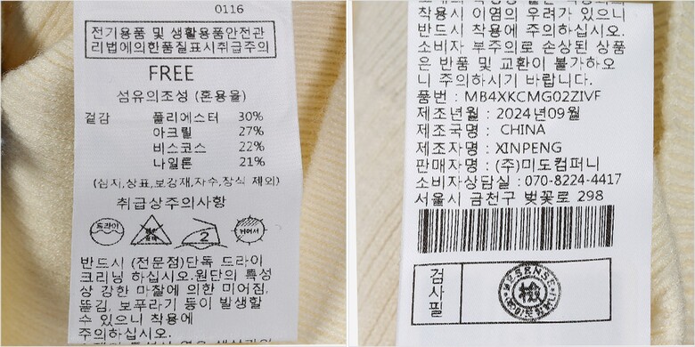 | 1. 제품 소재 (섬유의 조성 또는 혼용률을 백분율로 표시, 기능성인 경우 성적서 또는 허가서) | 겉감-폴리에스터30% 나일론21% 아크릴27% 비스코스22% |