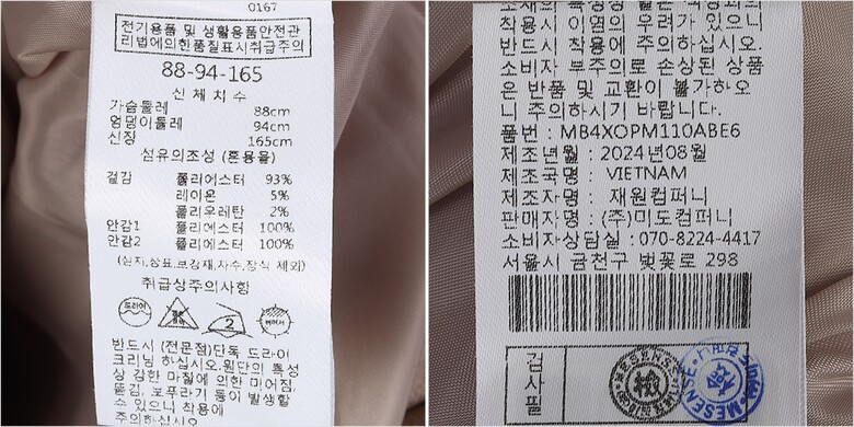 | 1. 제품 소재 (섬유의 조성 또는 혼용률을 백분율로 표시, 기능성인 경우 성적서 또는 허가서) | 겉감-폴리에스터93% 폴리우레탄2% 레이온5% 안감1-폴리에스터100% 안감2-폴리에스터100% |