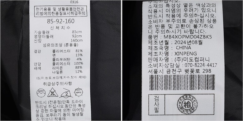 | 1. 제품 소재 (섬유의 조성 또는 혼용률을 백분율로 표시, 기능성인 경우 성적서 또는 허가서) | 겉감-면15% 폴리에스터81% 폴리우레탄4% 안감-폴리에스터100% 배색-레이온88%나일론12% |