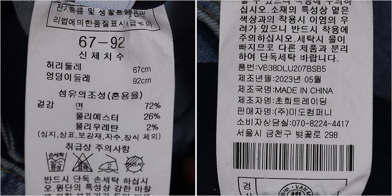 | 1. 제품 소재 (섬유의 조성 또는 혼용률을 백분율로 표시, 기능성인 경우 성적서 또는 허가서) | 겉감-면72% 폴리에스터26% 폴리우레탄2% |