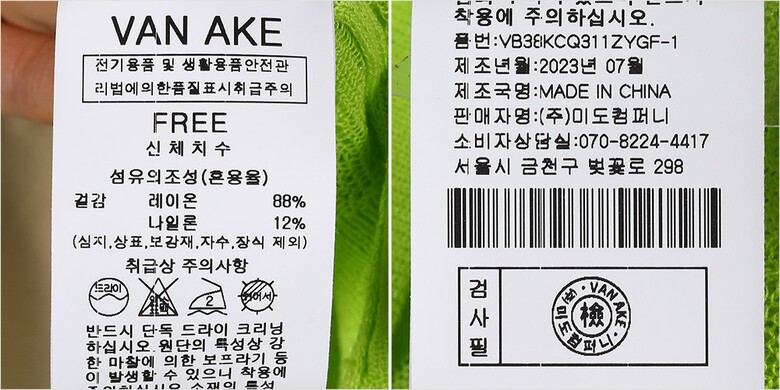 | 1. 제품 소재 (섬유의 조성 또는 혼용률을 백분율로 표시, 기능성인 경우 성적서 또는 허가서) | 겉감-나일론12% 레이온88% |