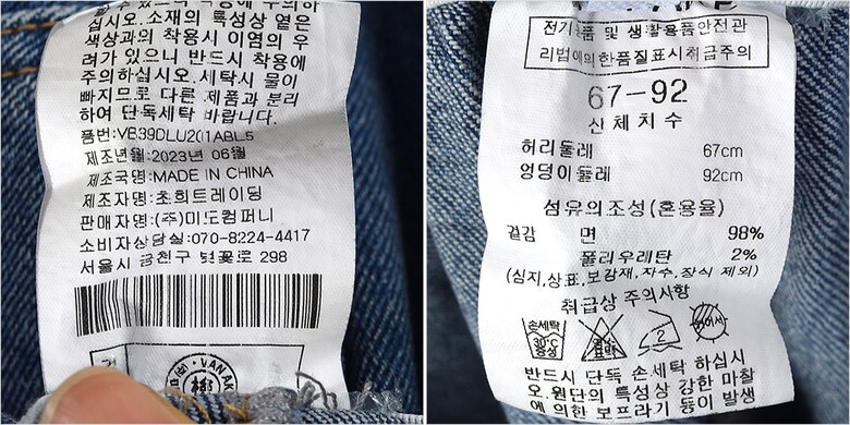 | 1. 제품 소재 (섬유의 조성 또는 혼용률을 백분율로 표시, 기능성인 경우 성적서 또는 허가서) | 겉감-면98% 폴리우레탄2% |