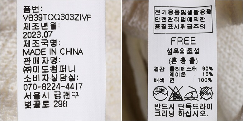 | 1. 제품 소재 (섬유의 조성 또는 혼용률을 백분율로 표시, 기능성인 경우 성적서 또는 허가서) | 겉감-폴리에스터90% 레이온10% 배색-면100% |
