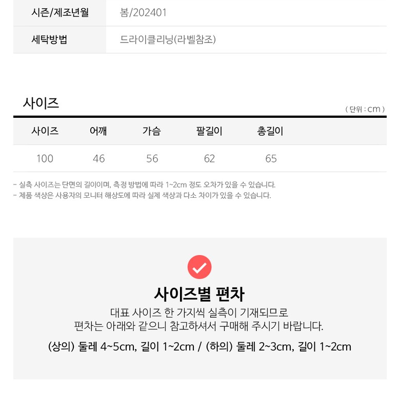 3. 치수 | 100사이즈실측기준 : 어깨46cm, 가슴56cm, 팔길이62cm, 총길이65cm |