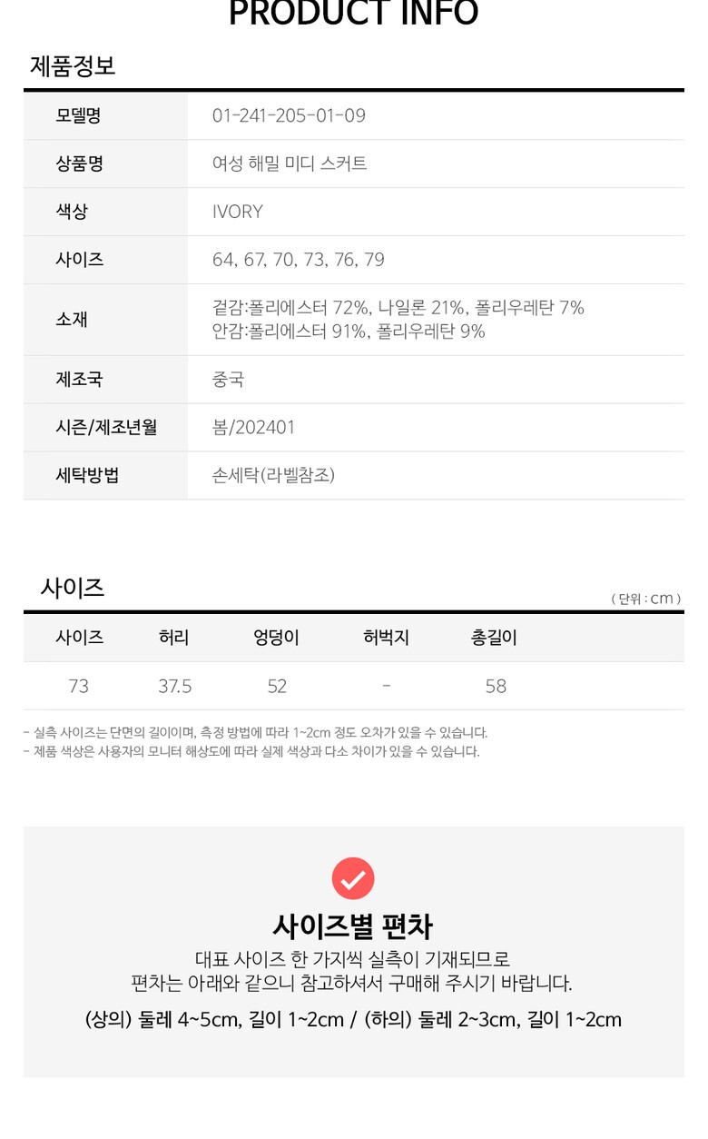 3. 치수 | 73사이즈실측기준 : 허리37.5cm, 엉덩이52cm, 총길이58cm 속바지 : 허리32cm, 허벅지25cm, 엉덩이41cm, 총장34.5cm |
