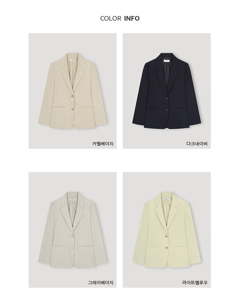 린넨 블렌드 원단으로 통기성이 우수한 싱글 투버튼 자켓입니다. 깔끔한 디자인으로 어디에나 활용하기 좋습니다. 브랜드만의 고급 소재를 활용하여 우수한 착용감을 선사합니다.