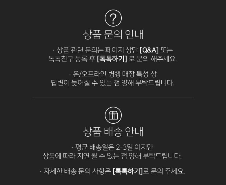 매장업무, 고객응대, 택배업무로 인해 다소 답변이 늦어질 수 있는 점 양해 부탁드립니다.