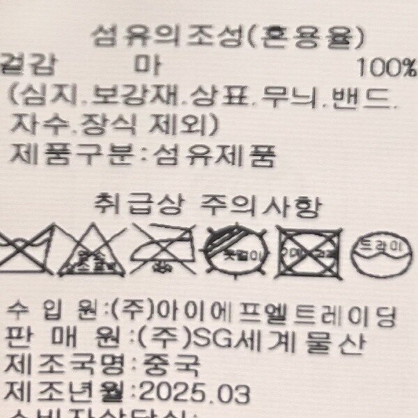 | 1. 제품 소재 (섬유의 조성 또는 혼용률을 백분율로 표시, 기능성인 경우 성적서 또는 허가서) | 겉감-마100% |
