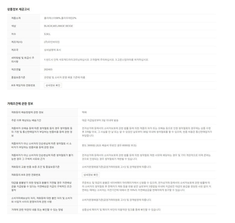 | 6. 세탁방법 및 취급시 주의사항 | 상품상세참조 |