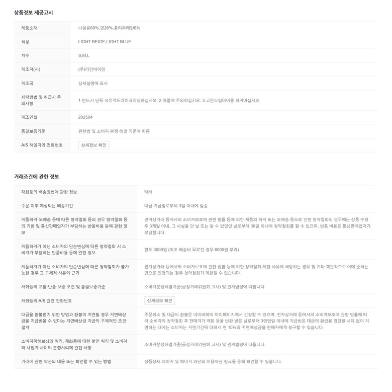| 6. 세탁방법 및 취급시 주의사항 | 상품상세참조 |