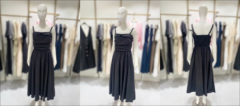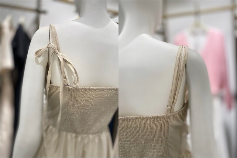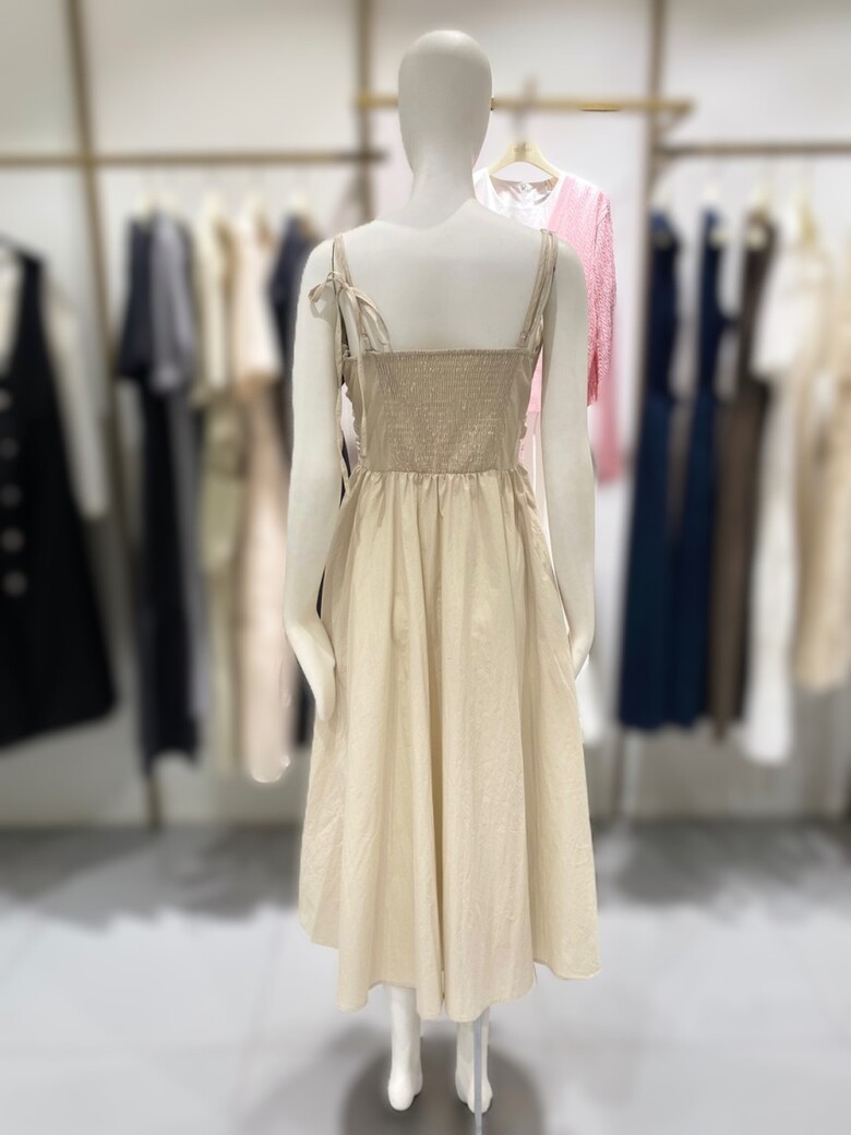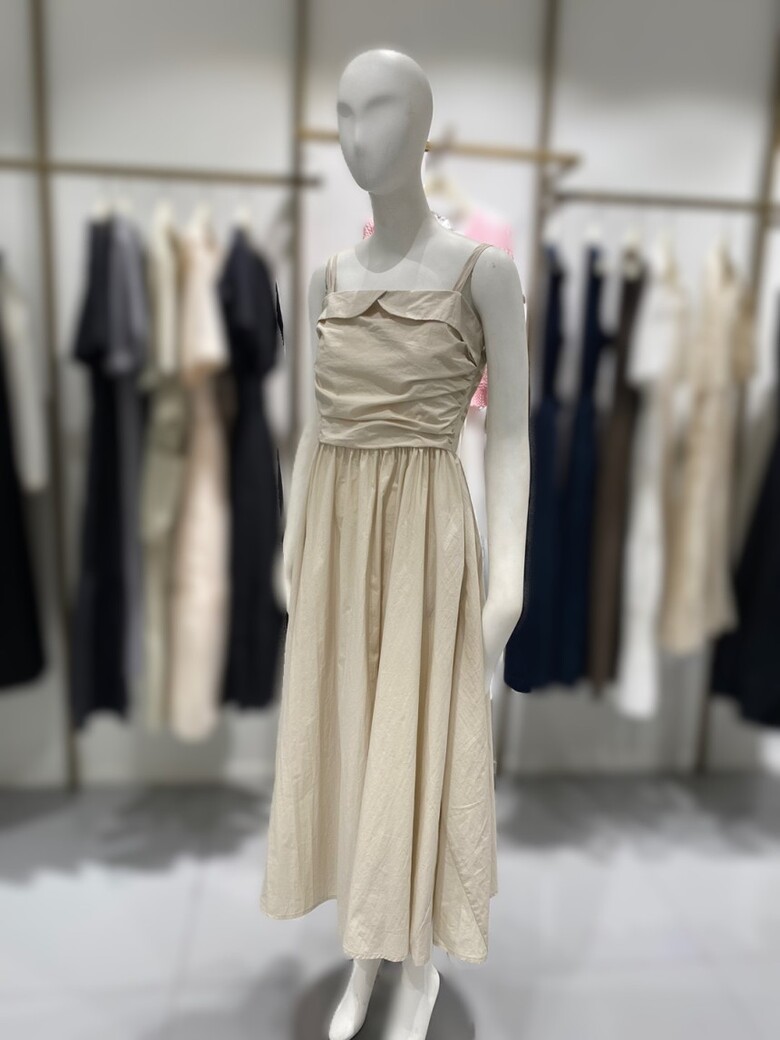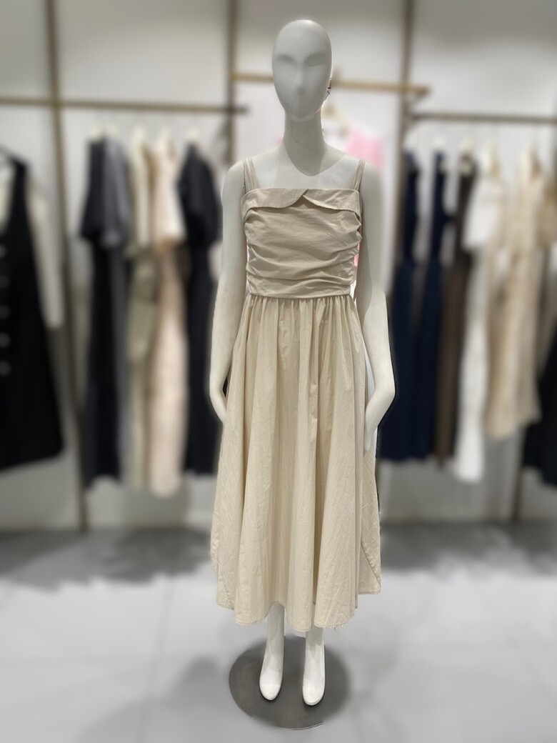 어깨끈과 허리밴딩으로 포인트를 준 여성스러운 원피스입니다.