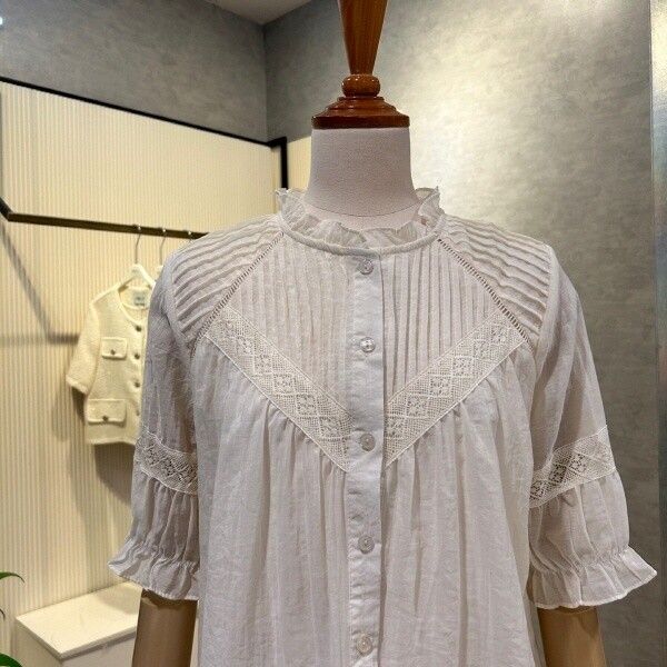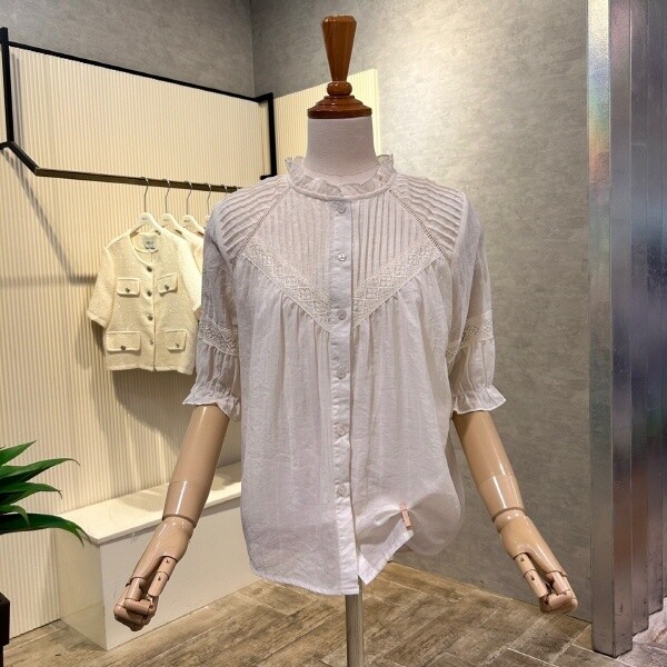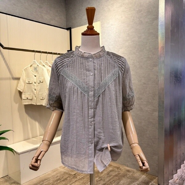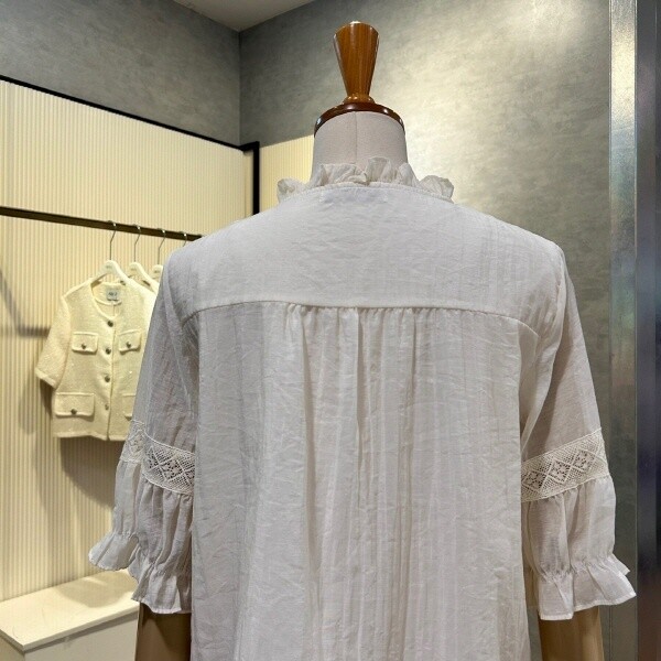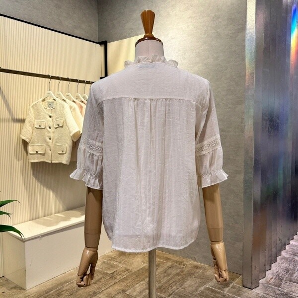 2025년 s/s?신상?프릴 넥 자수 라인 블라우스 입니다.