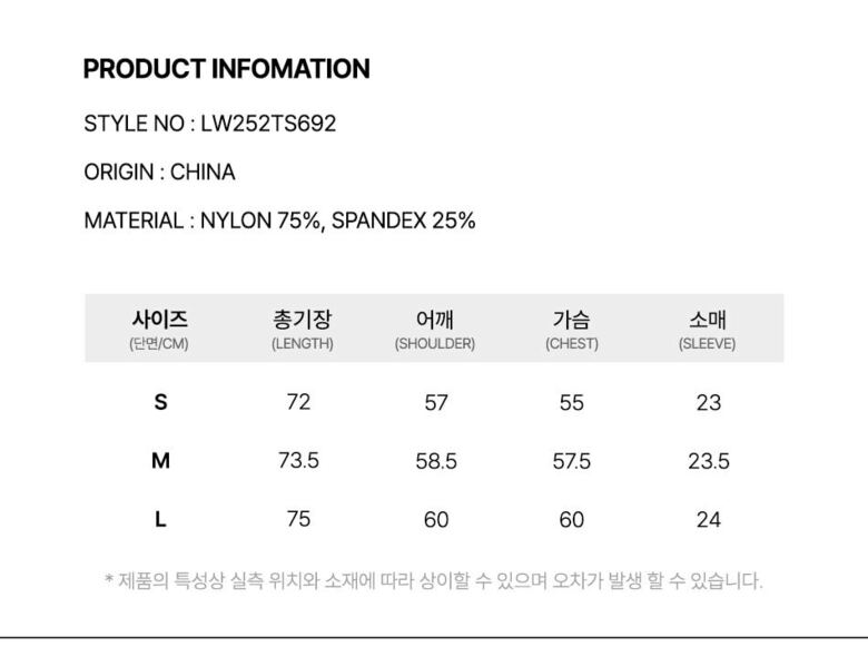 | 1. 제품 소재 (섬유의 조성 또는 혼용률을 백분율로 표시, 기능성인 경우 성적서 또는 허가서) | 겉감:나일론 75%, 폴리우레탄 25% |