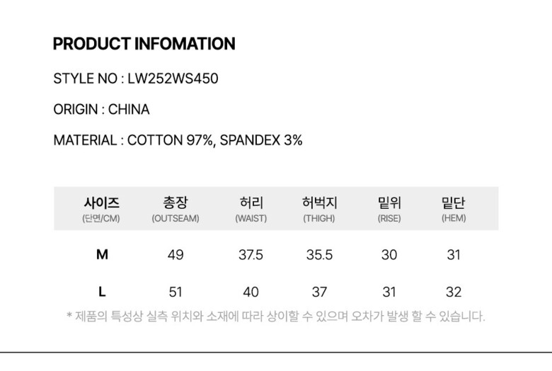 | 1. 제품 소재 (섬유의 조성 또는 혼용률을 백분율로 표시, 기능성인 경우 성적서 또는 허가서) | 겉감:면 97%, 폴리우레탄 3% |