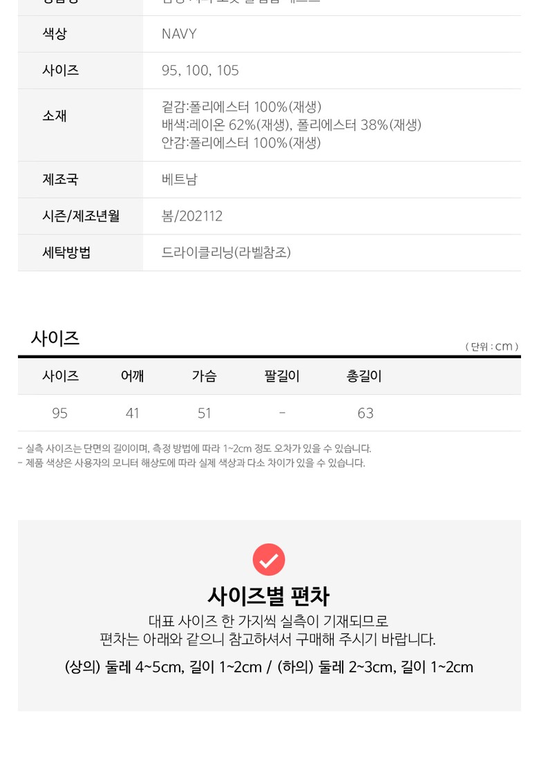 3. 치수 | 95사이즈기준실측 : 어깨41cm, 가슴51cm, 총길이63cm |