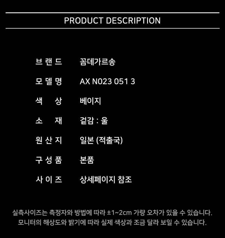 | 1. 제품 소재 (섬유의 조성 또는 혼용률을 백분율로 표시, 기능성인 경우 성적서 또는 허가서) | 상세페이지 참조 |