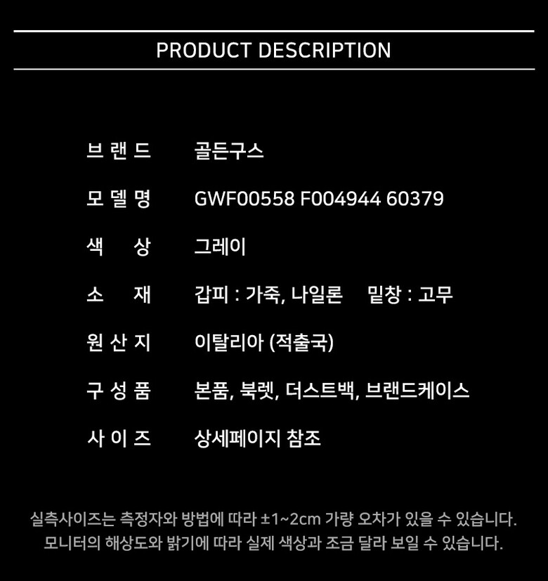 | 1. 제품 소재 (운동화인 경우에는 겉감, 안감을 구분하여 표시) | 상세페이지 참조 |