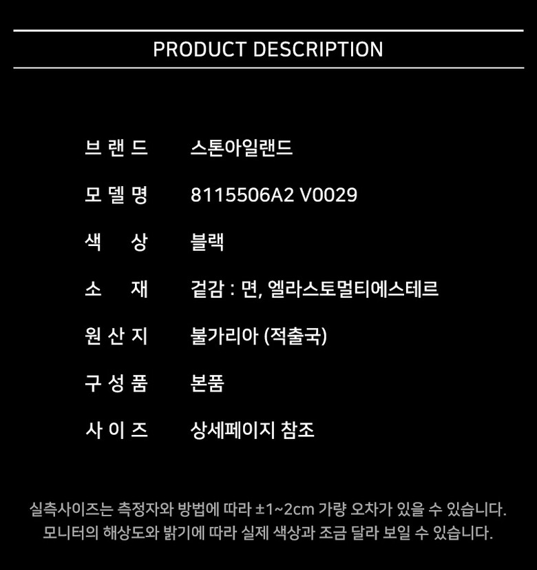 | 1. 제품 소재 (섬유의 조성 또는 혼용률을 백분율로 표시, 기능성인 경우 성적서 또는 허가서) | 상세페이지 참조 |