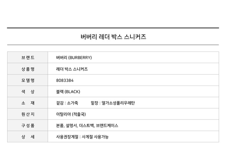 [명품] 버버리 레더 박스 스니커즈 블랙 8083384