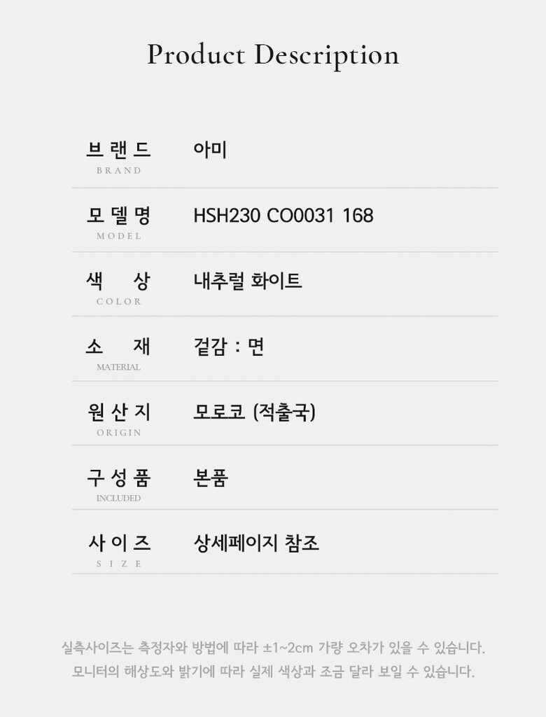 | 1. 제품 소재 (섬유의 조성 또는 혼용률을 백분율로 표시, 기능성인 경우 성적서 또는 허가서) | 상세페이지 참조 |