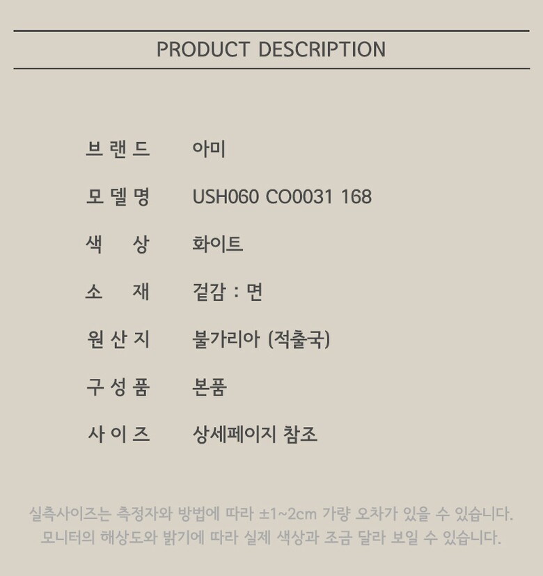 | 1. 제품 소재 (섬유의 조성 또는 혼용률을 백분율로 표시, 기능성인 경우 성적서 또는 허가서) | 상세페이지 참조 |