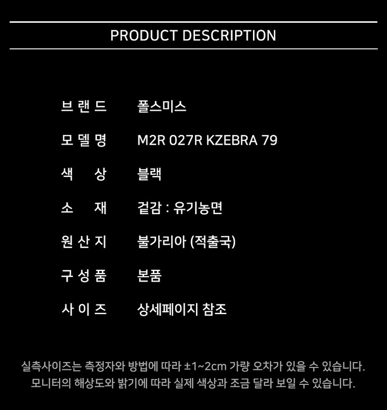 | 1. 제품 소재 (섬유의 조성 또는 혼용률을 백분율로 표시, 기능성인 경우 성적서 또는 허가서) | 상세페이지 참조 |