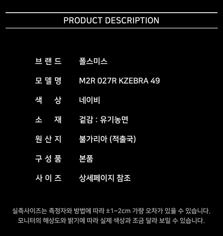 | 1. 제품 소재 (섬유의 조성 또는 혼용률을 백분율로 표시, 기능성인 경우 성적서 또는 허가서) | 상세페이지 참조 |